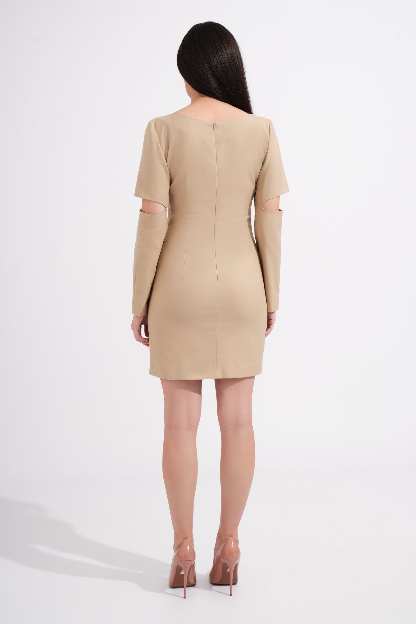 Make a subtle yet unforgettable statement in this beige mini dress featuring unique cape-style long sleeves with cut-out arm openings. The straight silhouette creates a sleek, refined look, while the innovative sleeve design allows the arms to slide through discreet slits, letting the rest of the sleeve drape gracefully like a cape.