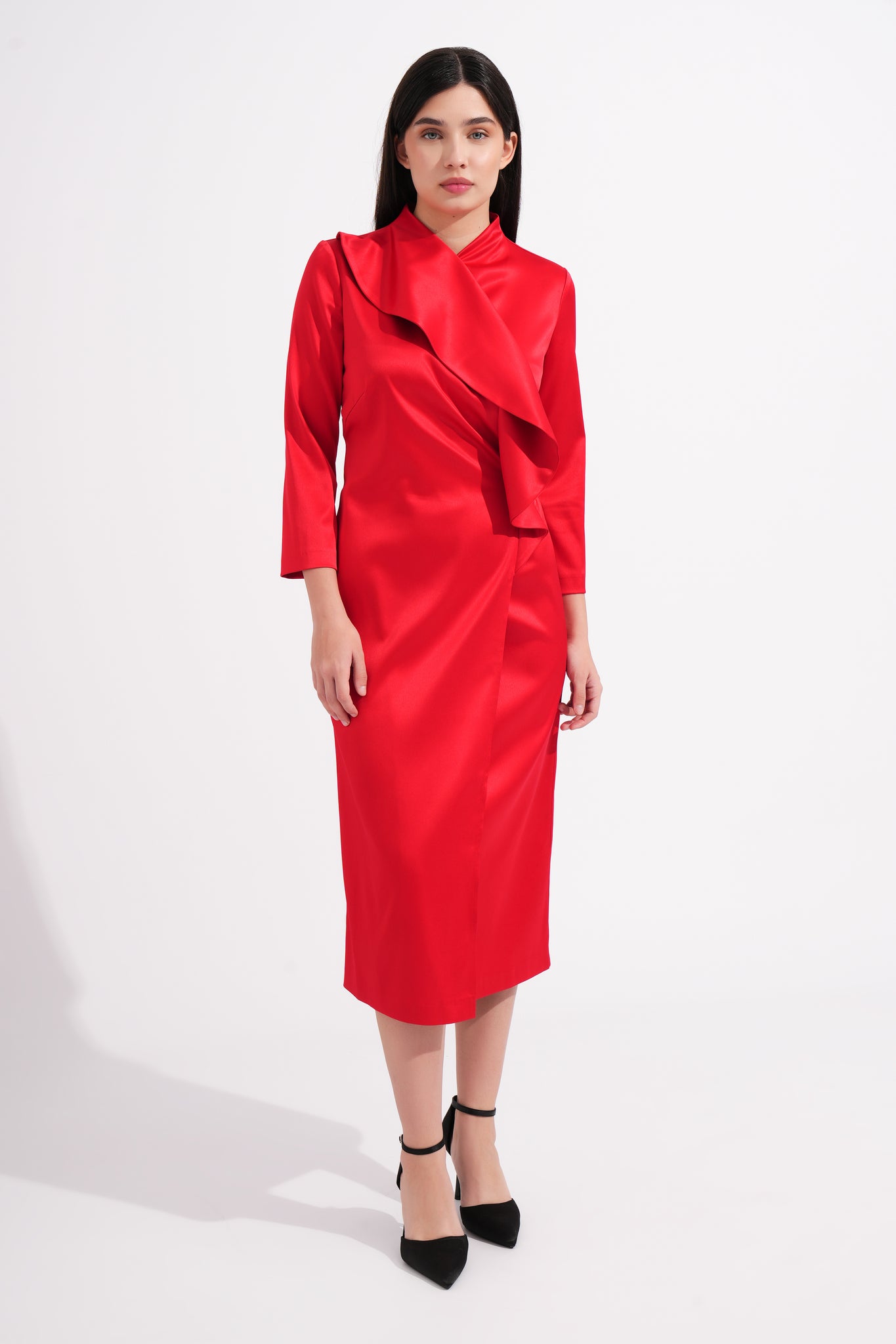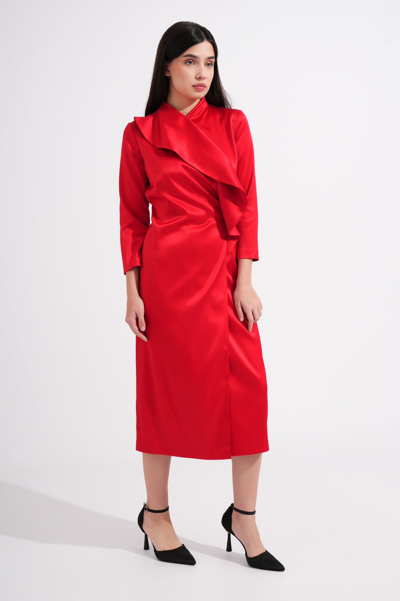 Make a bold entrance in this red satin wrap midi dress featuring a draped ruffle detail and long sleeves. The luxurious satin fabric creates a smooth silhouette, while the wrap design accentuates the waist. Perfect for holiday parties, evening events, or special celebrations, this elegant 3/4 sleeve dress adds sophistication and allure. Style it with heels and statement earrings for a timeless look.