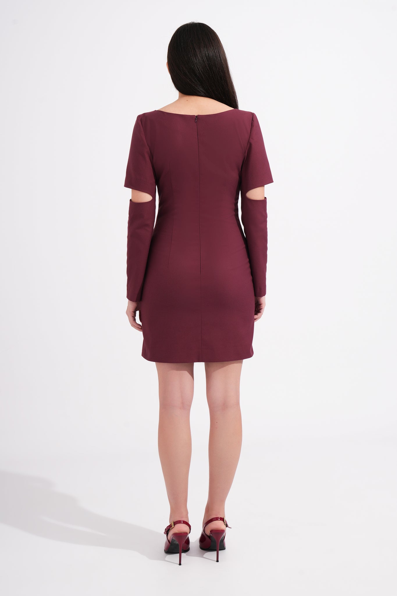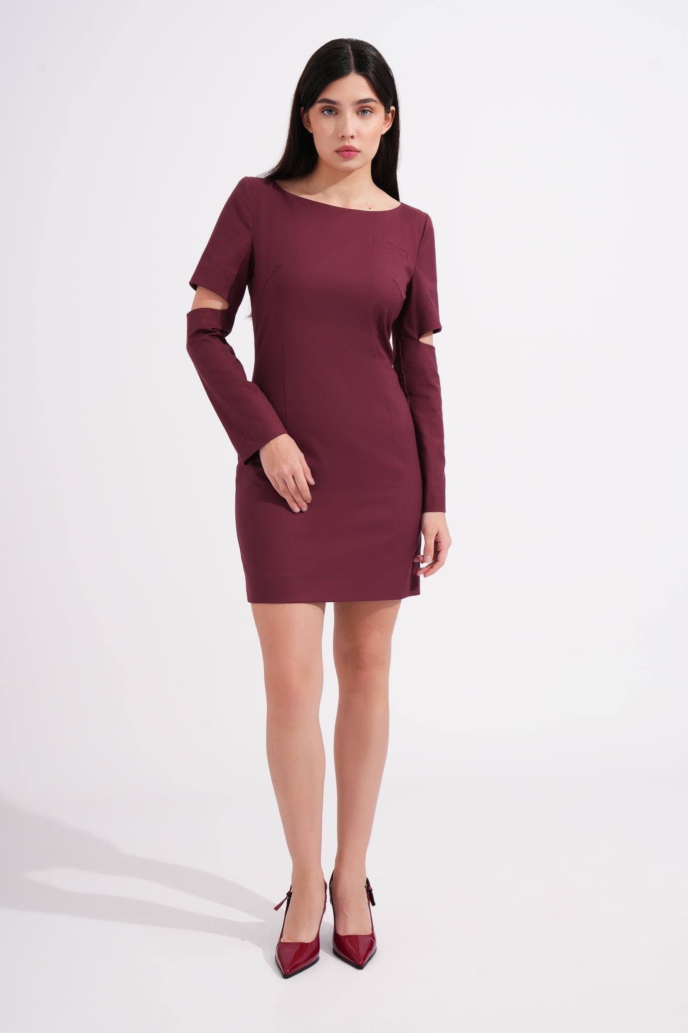 Make a bold statement in this elegant burgundy mini dress featuring unique cape-style sleeves with cut-out arm openings. The minimalist silhouette contrasts beautifully with the unexpected sleeve design, creating a sophisticated yet fashion-forward look.
